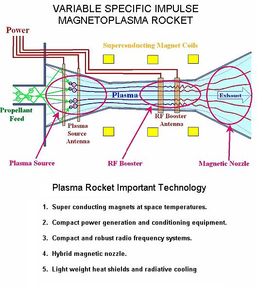 பிளாஸ்மா ராக்கெட் எஞ்சின் பரிதியின் உஷ்ணத்தை (Plasma Starts at 10,000 C) அடைந்து எரிசக்தி வாயுவை அயனிகள் (Ionized Gas Fuel) ஆக்கி உந்தும் பிணைவு நுணுக்கத்தைப் (Fusion Technology) பயன்படுத்துகிறது. பிளாஸ்மா எஞ்சினில் மூன்று கட்ட சாதனங்கள் இயங்குகின்றன. முன்னரங்கம், மைய அரங்கம், பின்னரங்கம் (Forward Cell, Central Cell & Aft Cell) என்று முக்கட்ட அமைப்பு ராக்கெட் இணைப்பாகச் சேர்க்கப் பட்டுள்ளது.