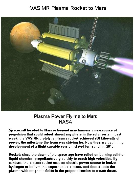 இந்தக் குறிக்கோளில் இப்போது 200 கி. வாட் பிளாஸ்மா ராக்கெட் எஞ்சின் ஒன்று வெற்றிகரமாகத் தயாராகி உள்ளது. ஆனால் இந்த ராக்கெட் எஞ்சின் கனமான விண்கப்பலைப் பூமியிலிருந்து தூக்கிச் செல்ல உதவாது. திரவ அல்லது திடவ எரிசக்தியில் (Solid or Liquid Fuel) இப்போது போல் ஏவப்பட்டுச் சுற்றுப் பாதையில் விடப்பட்ட விண்கப்பலை விரைவாக நெடுநாளைக்கு உந்திச் செல்ல அவை பயன்படும். நாசா இந்தப் பிளாஸ்மா ராக்கெட் எஞ்சினை 2013 ஆவது ஆண்டில் முதன் முதலாக அகில நாட்டு விண்வெளி நிலையத்துடன் (International Space Station) இணைத்துச் சோதனை செய்யத் திட்ட மிட்டுள்ளது.
