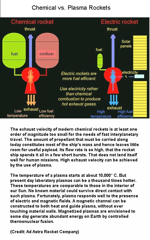 1960 -1970 ஆண்டுகளில் சந்திரனில் கால்வைத்த விண்வெளித் தீரர்களைச் சுமந்து சென்ற சனி -5 ராக்கெட் (Saturn V Rocket) திரவ எரிசக்தியில் இயங்கி விருத்தியானது. அடுத்து விண்வெளி மீள்கப்பலில் (Space Shuttle) பயன்பட்டவை திடவ எரிசக்தியில் இயங்கிய ஏவுகணைகள். இவை இப்போது மெதுவாய்ச் செல்லும் புராதன ராக்கெட்டுகளாகி விட்டன ! அதி வேகத்தில் போகும் புதிய அயான் எஞ்சின் ராக்கெட்டுகள் எதிர்காலத்துக்காகப் படைக்கப்பட்டு வருகின்றன ! புதிய பிளாஸ்மா ராக்கெட்டுகள் 300 மடங்குக்கும் மேற்பட்ட வல்லமையில் இயங்குபவை. அதி வேகமாய் இயங்கிப் பயணக் காலத்தைக் குறைப்பவை. அவற்றில் நகரும் யந்திரச் சாதனங்கள் மிகவும் குறைவு. சாதாரண இரசாயனத் திரவ எரிசக்தியில் உந்தும் ராக்கெட்டில் செவ்வாய்க் கோளுக்குச் செல்ல சுமார் இரண்டு வருடங்கள் எடுக்கும் போது, பிளாஸ்மா ராக்கெட் மூலம் பயணத்தை நாற்பது நாட்களில் முடிக்கலாம். அதற்குத் தேவைப்படும் ஆர்கான் எரிவாயுவின் கொள்ளளவு மிகக் குறைவானதே.