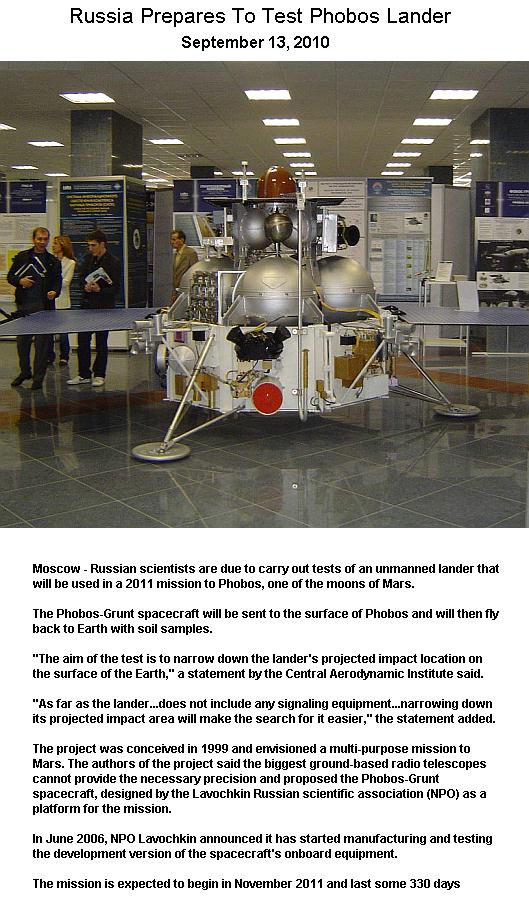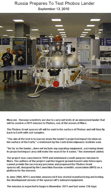 2011 ஆண்டு இறுதியில் மனிதரற்ற ஓர் விண்ணுளவி செவ்வாய்க் கோளைச் சுற்றிவந்து, அதன் பெரிய துணைக்கோளான •போபாஸில் (Phobos) இறங்கி மாதிரி மண்ணை அள்ளிக் கொண்டு முதன்முதலாய்ப் பூமிக்கு மீளும் என்று ரஷ்ய விஞ்ஞானிகள் அறிவித்துள்ளார். அந்த ரஷ்ய விண்ணுளவியின் பெயர் •போபாஸ்-கிரண்ட் (Phobos-Grunt) என்பது. செவ்வாய்க் கோளைச் சுற்றும் கோள் சுற்றி (Mars Orbiter) செவ்வாயின் சூழ்வெளியையும், தூசிப்புயல் அடிப்பையும், சூரிய ஒளிப்பிழம்பு, கதிர்வீச்சுகளை (Mars Atmosphere, Dust Storms, Plasma & Radiation) ஆராயும். இந்த ரஷ்ய ஏவுகணைத் திட்டத்தில் சைனாவின் செவ்வாய்க் கோள் சுற்றி "இங்குவோ-1" (Chinese Mars Orbiter Yinghuo-1) ஒன்றும் ஏற்றிச் செல்லப்படும். இந்தப் பயணம் வெற்றி பெற்றால் நிலவைப் போல் செவ்வாய்த் துணைக்கோள் மாதிரியை முதலில் பூமிக்குக் கொண்டு வந்த வரலாற்று முதன்மை அடையும் ரஷ்யா !